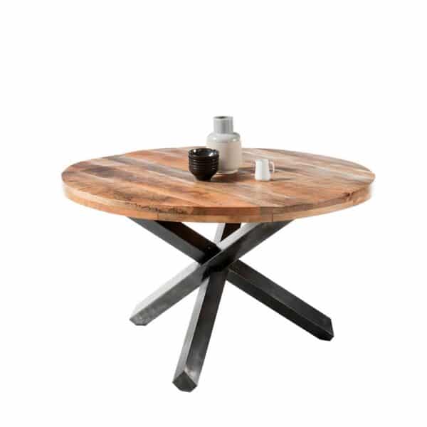 Verleihe Deinem Esszimmer, Wohnzimmer oder Deinem Home-Office einen Hauch von natürlicher Eleganz und industriellem Charme mit unserem runden Tisch aus massivem Mangobaumholz. Dieser Tisch ist mehr als nur eine Ablagefläche – er ist ein Statement, ein Ort der Begegnung und ein Zeugnis für Deinen guten Geschmack.